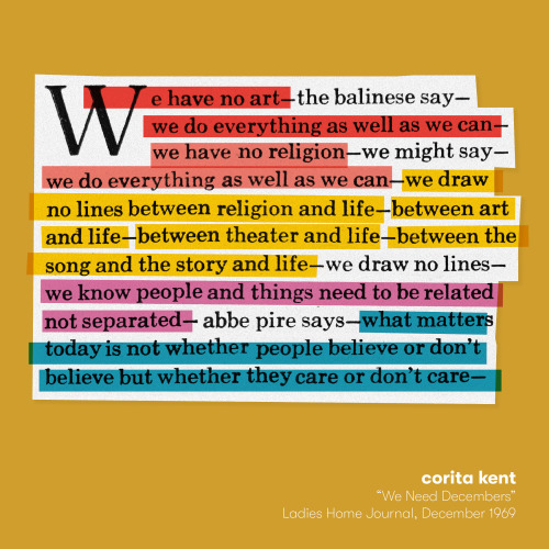 We had a hard time not highlighting every word in this clipping from “We Need Decembers,” an article by Corita in the December 1969 issue of Ladies Home Journal. Read the full article here.